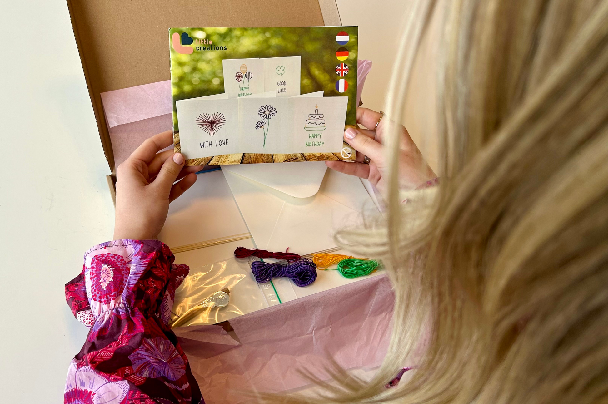 Het borduurkaarten pakket vormt een mooie aanvulling op de borrelplank. Door eerst het patroon in de kaart te prikken en daarna te borduren met gekleurd garen, maak je eenvoudig een persoonlijke kaart. De kaarten zijn geschikt voor allerlei gelegenheden en geven elk gebaar een extra persoonlijke touch.