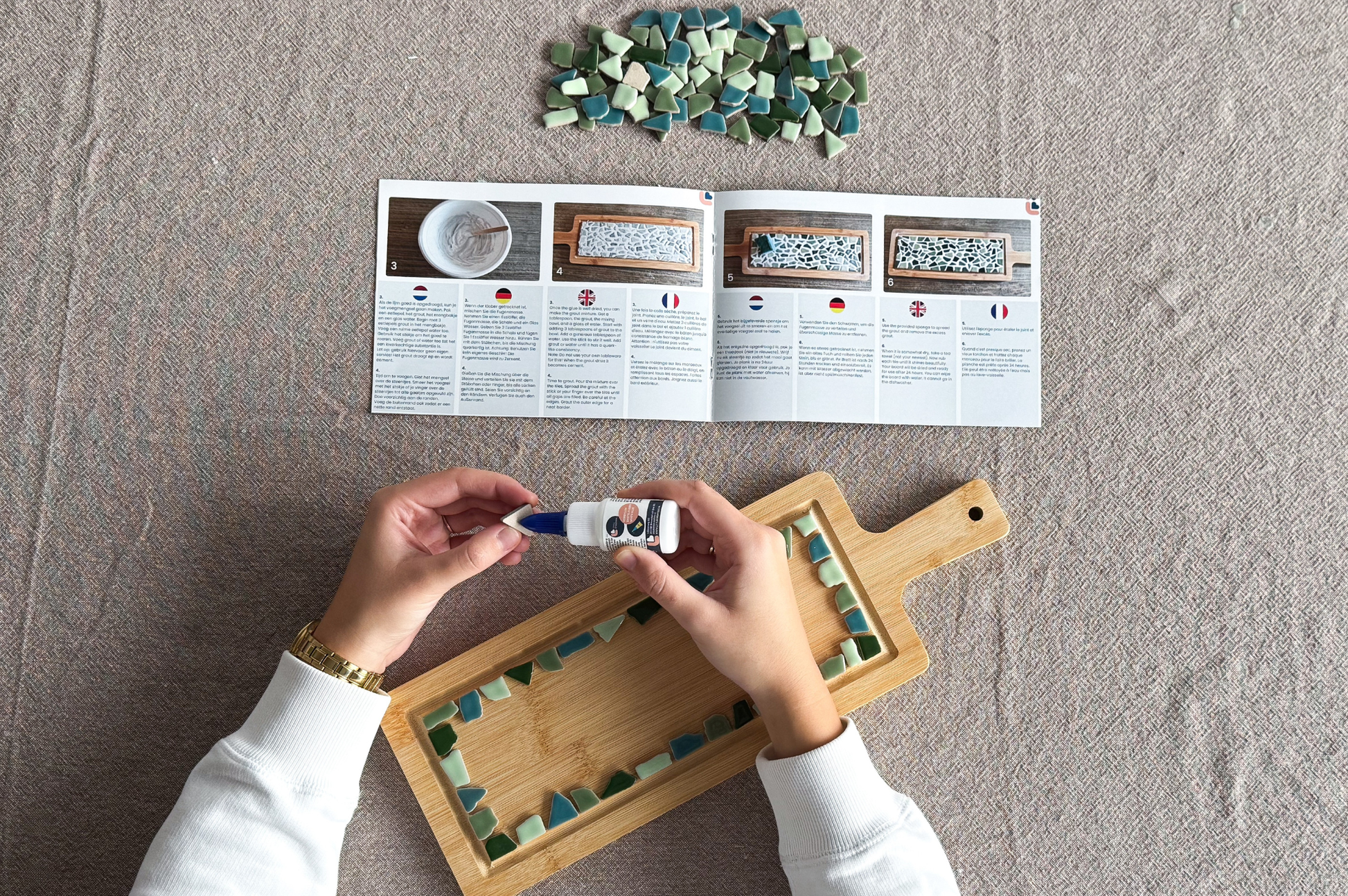 Met de mozaïek borrelplank ga je aan de slag met het leggen van kleurrijke mozaïeksteentjes op een bamboehouten plank. Je kiest zelf een kleurmix die past bij jouw stijl en maakt stap voor stap een item dat je kunt gebruiken én laten zien. De duidelijke handleiding maakt het project toegankelijk voor iedereen.